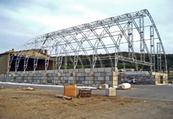 on an engineered, 5-block high (12’-6 overall height) Lock-Block wall. The exclusive MegaDome® motorized continuous ridge vent provides controlled ventilation.