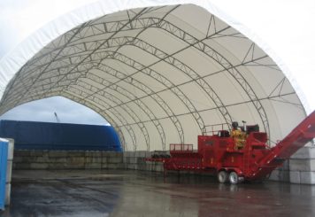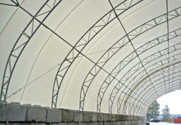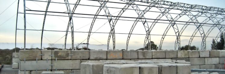 MegaDomes. An asphalt floor and 2 rows of concrete Lock-Blocks provide the foundation and workspace for the naturally lit fabric covered structures.